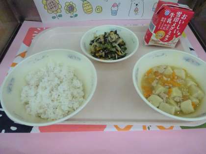 今日の給食は、麦ごはん・牛乳・高野どうふのそぼろ煮・ほうれん草と切干大根のごま煮でした。