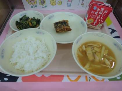 今日の給食は、ごはん・牛乳・さばのたつたあげ・ほうれん草のごま煮・みそ汁でした。