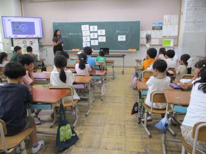 2年生 英語活動「いくつかなクイズをしよう」 公開日 2024/09/04 更新日 2024/09/04 2年生のページ ALTの先生と一緒に数の言い方の学習をしました。様々なゲームをしながら1〜10の言い方を学習することができました。
