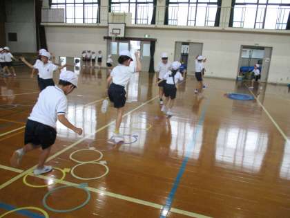 体育館で友達の真似をする学習をしました。フラフープやコーンやミニハードルを使って楽しみながら学習する姿が見られました。