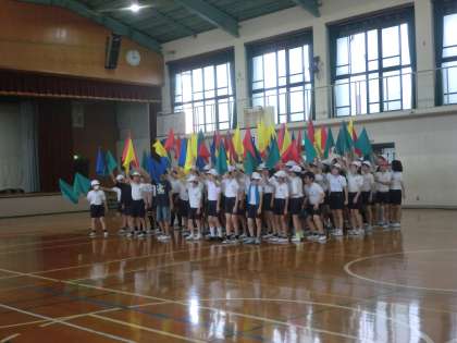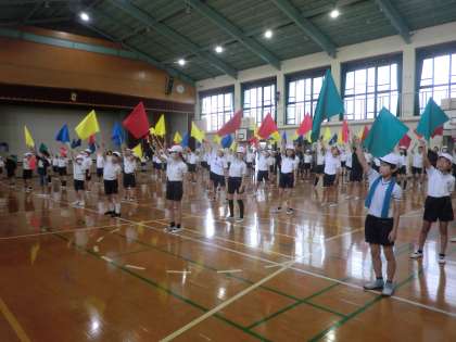 フラッグを動かす速さやタイミングを確認し、全員がぴったりとそろうことを目指しています。
