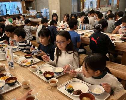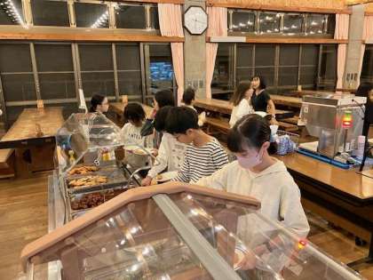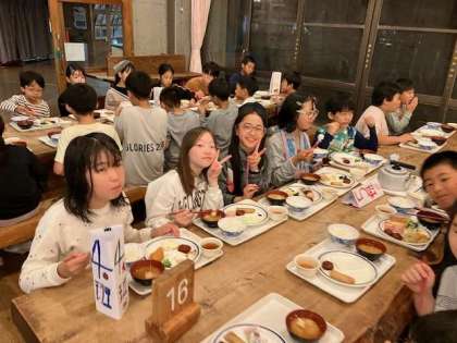 子どもたちは風呂も入ってさっぱりとした後、夕食です。たくさん体を動かしたので、よく食べています。