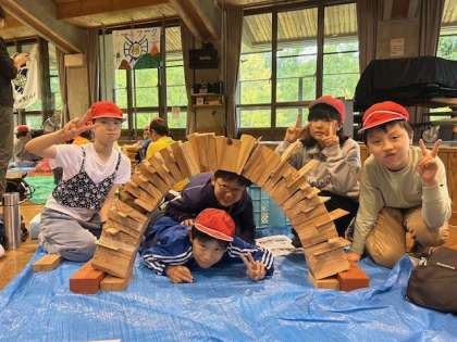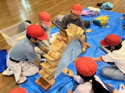 「わーー!」と歓声が聞こえち完成できたグループもあれば、最後の土台を外すときに崩れてしまって「あーー!」という悲鳴が聞こえてきたりします。12グループのうち、いくつ完成できるのでしょう。