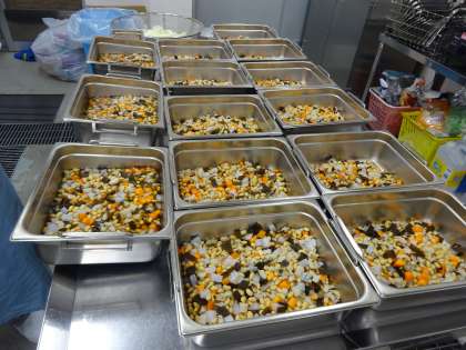 五目煮豆は、スチームコンベクションオーブンで蒸して作りました。「五目」には、「たくさんの」という意味があります。大豆・にんじん・昆布・こんにゃく・ちくわが入っていました。大豆の大きさに合わせて、こんにゃくやちくわ、にんじんも小さく切っています。お豆や昆布がふっくらと美味しく仕上がっていました。