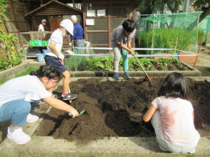 夏野菜を収穫した後、土に栄養を入れて、休ませていたおひさま畑に、今日は、冬野菜の種まきをしました。