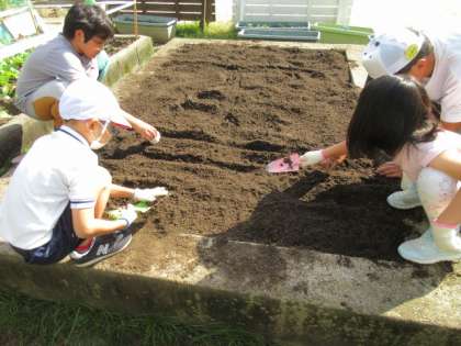 地域の方にお世話になり、種の撒き方や水やりの仕方など、丁寧に教えてもらって、みんなで協力して種まきを行うことができました。大切に育てていきたいと思います。