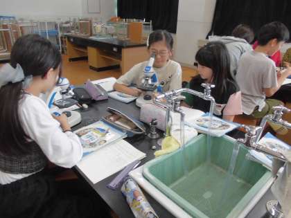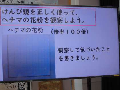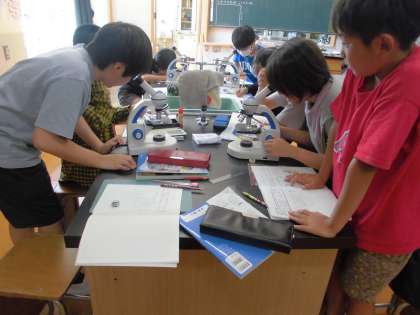 5年生は、理科で顕微鏡を使いました。ヘチマの花粉を顕微鏡で見て、「コーヒー豆みたい」「すごくよく見えてびっくりした」など、いろいろな感想が聞かれました。