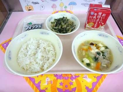 今日の給食は、麦ごはん・牛乳・豚肉ととうふのくず煮・ほうれん草ともやしのごま煮・じゃこでした。野菜たっぷりおいしくいただきました。