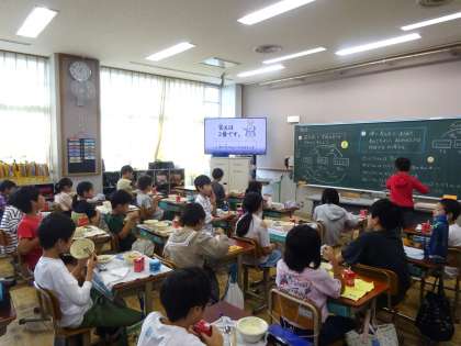 運動会に向けてどの学年も練習を頑張っています。ご飯は、運動をするためのエネルギーにもなるのでとても大切です。今日は、ご飯の栄養についてや給食での上手な配り方についてムービーを見ました。「麦ごはんと白いごはんはどっちも同じ重さなんだ!」「運動会がんばりたいし、ごはんのおかわりしておいてよかった!」と話していた子もいました。
