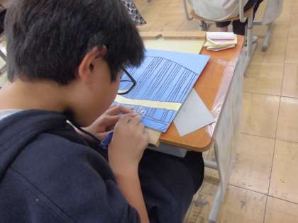 図工では版画をしています。いよいよ彫刻刀を使っての活動になりました。作業板を使い、手を前に置かないことなどを念頭に置いて、安全に気を付けて彫刻刀を使っていきます。