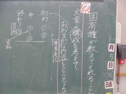 国語では「固有種が教えてくれること」の学習に入っています。今日は、文章を「初め」「中」「終わり」に分けて、書いてある内容についておおまかにとらえることができました。