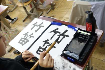 4年生では「竹笛」の学習をしています。この日は上の部分と下の部分との組み立て方に気をつけて書く練習をしました。「竹」が「たけかんむり」に変わると高さや点画が変化することに気づきました。