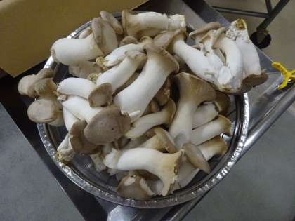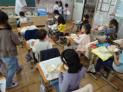きのこを使った新献立でした。きのこが苦手な子にも食べやすいように、しいたけ・エリンギを薄く小さく切っています。