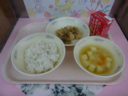 今日の給食は、麦ごはん・牛乳・鶏肉ときのこごま甘酢あんかけ・とうふのスープでした。