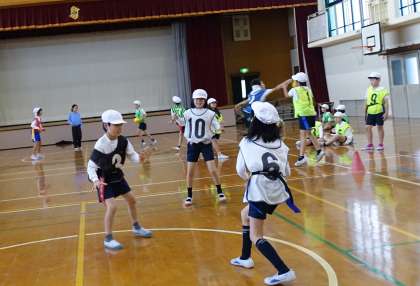 4年生 体育「タグラグビー」 公開日 2024/11/14 更新日 2024/11/14 4年生のページ 4年生では、タグラグビーの学習をしています。この日はパスの練習や簡単なゲームをしました。ボールを受けやすい位置に走ることや相手の胸の高さを目安にパスをすることなどの大切さに気づくことができました。