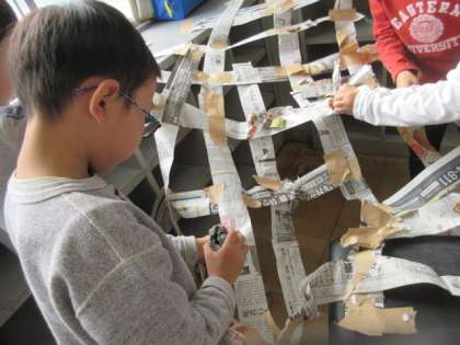 新聞紙と新聞紙をセロテープやガムテープでつけたり、壁や机などからつるしたりと、つけ方を工夫をしながら楽しんでいました。