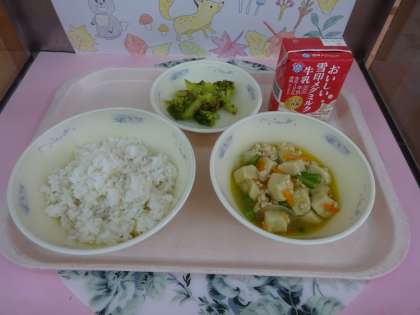 今日の給食は、麦ごはん・牛乳・高野どうふのそぼろ煮・ブロッコリーのおかか煮でした。