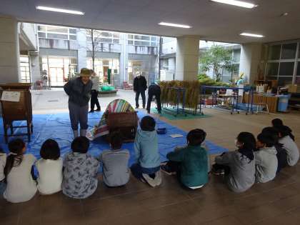 5年生、お米作り! 公開日 2024/11/22 更新日 2024/11/22 学校の様子 今日はゲストティーチャーと学校運営協議会のみなさんと一緒に脱穀、もみすりを行います。 現代の機械を使うのではなく、昔の農具を使っています。 先日は農具の修理も行っていただきました。 お米作りの活動を通して、食料を得る大変さを味わっています。