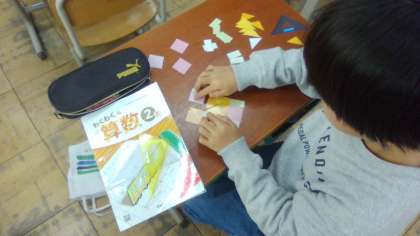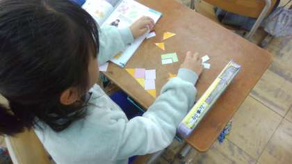 算数の学習では習った三角形や四角形を使って形を作る学習をしました。「直角三角形をつなげると正方形ができるんだな」や「正方形と長方形をつなげると長方形ができるな」など初めて知ったことに驚いている姿が見られました。