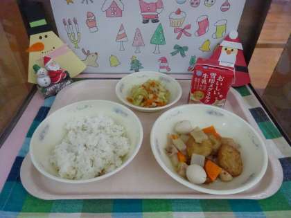 今日の給食は、麦ごはん・牛乳・平天とこんにゃくの煮つけ・キャベツのごま煮でした。平天とこんにゃくの煮つけには、平天・こんにゃく・うずら卵が入っています。プニプニとした食感の食材がたくさんでした。