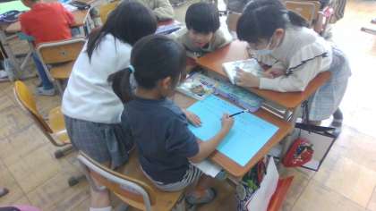 インタビューに行ったグループで集まって、インタビューにさせてもらったお礼のお手紙を書きました。子どもたちはどんなことが書いてあると喜ぶか考えながらお礼のお手紙をグループで協力して作ることができました。