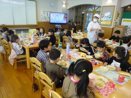 1年2組のみなさんが、初めてのランチルーム給食でした。朝からとっても楽しみにしていたようでした。「グラタンはフランスの料理だね!」「ペンネの形が本当にペンみたいだね!」とグラタンについても話題にしていました。
