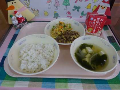 今日の給食は、麦ごはん・ビビンバの具(肉と卵・ナムル)・わかめスープでした。