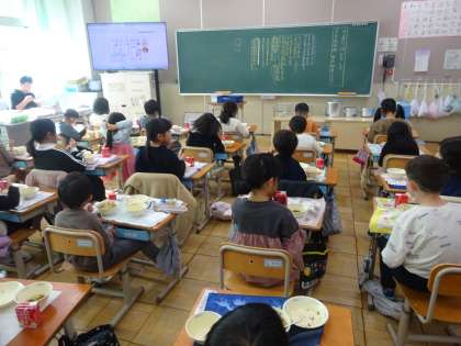 子どもたちは、「ビビンバは韓国の料理だったね!」「韓国の食事のマナーも知ってるよ!」「韓国の箸は、形は日本と似ているけど金属でできてるよ」など、日本と違う食文化について話題にしていました。他の国の料理や、韓国の他の料理も食べたいなと言っていました。給食を通して、いろんな国のことに興味をもつことができていました。