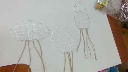持ってきた材料を組み合わせて、生き物を表した版を作っています。どんな作品が完成するのか、楽しみです。
