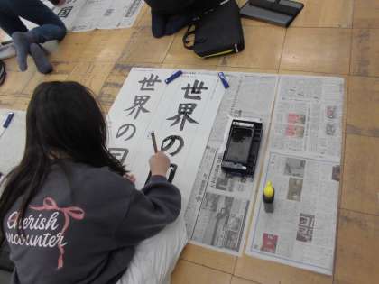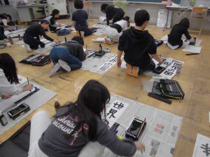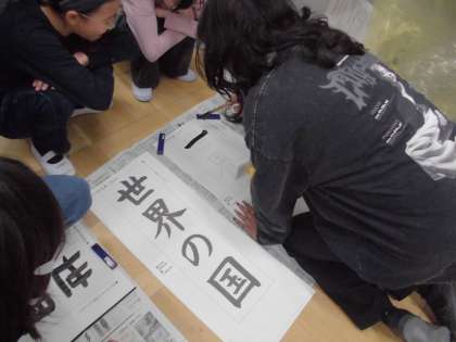 書写の時間に書き初めをしました。「世界の国」という文字について、書き順や気をつけるポイントを学習した後に、練習用紙で練習をしました。その後、緊張した様子で画仙紙に清書をしました。途中、ALTの先生も飛び入り参加して、一緒に書き初めをしました。