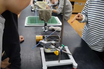 この日は示温インクを塗った金属棒をあたため、あたたまり方を観察しました。金属は熱した部分から順に熱が伝わっていくのだと気づくことができました。