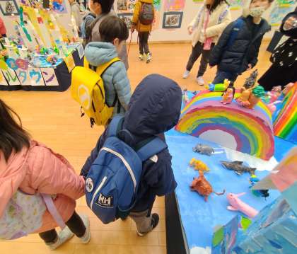 【おひさま】小さな巨匠展の見学に行きました 公開日 2025/02/12 更新日 2025/02/12 おひさま学級 バスに乗って、京都市美術館別館で行われていた「小さな巨匠展」に行きました。自分たちの作った作品を見つけたり、合同作品作りを行った上京支部の友だちの作品を鑑賞したりしました。また、昨年卒業して中学校に行った友だちの作品も見ることができて、嬉しそうでした。
