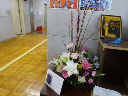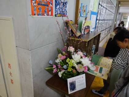 本日、京都府花商協同組合から京都府産の「花桃(はなもも)」を使ったアレンジメントのプレゼントがありました。