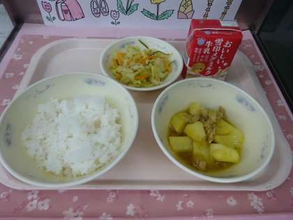 今日の給食は、ごはん・牛乳・肉じゃが(カレー味)・ごま酢煮でした。