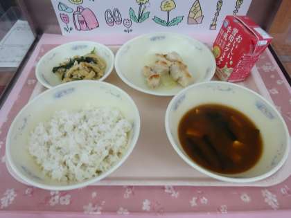 今日の給食は、麦ごはん・牛乳・鶏肉のゆず塩焼き・切干大根の煮つけ・赤だしでした。