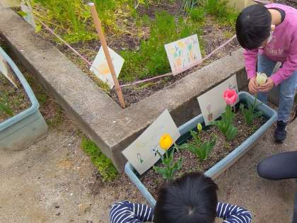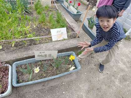 【おひさま】お花が咲きました 公開日 2025/04/14 更新日 2025/04/14 おひさま学級 今年度初めて、おひさま畑に水をやりにいきました。 昨年度、植えた「チューリップ」「水仙」が咲いていました。