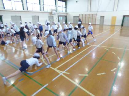 今日は学年体育をしました。学年で集まり体ほぐしの運動に取り組むことができました。