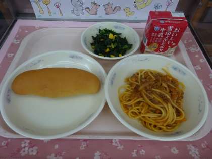 4月15日(火)から給食もスタートしました。小型コッペパン・牛乳・スパゲティのミートソース煮・ほうれん草のソテーという献立でした。
