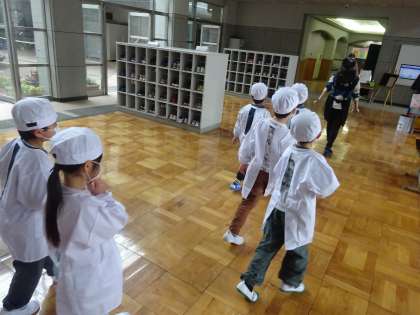 1年生も給食エプロンを身につけて、給食室へ行き、自分たちで給食を運ぶことができました。