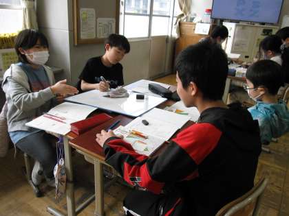 算数〜対称な図形〜 公開日 2025/04/16 更新日 2025/04/16 6年生のページ 算数の授業では、対称な図形の学習をしました。いろいろなアルファベットが対称な図形に当てはまるかを考えて、グループワークをしました。