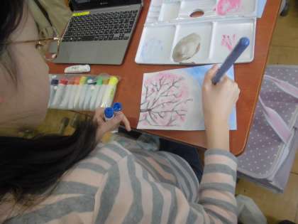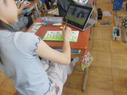 GIGA端末で写真を撮ったあと、絵の具で自分が感じた春を表現しました。筆の種類や、絵の具の量などをかえながら工夫して描きました。