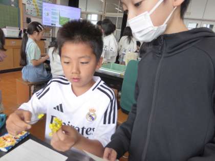 アブラナの花を見てつくりを調べました。ピンセットを使い、花はどのようなつくりになっているのか観察しました。