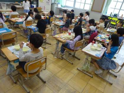 今日の給食は、ごはん・牛乳・鶏肉のからあげ・はるさめスープ・りんごゼリーでした。こどもの日をお祝いするため、みなさんに喜んでもらえるような献立となっていました。