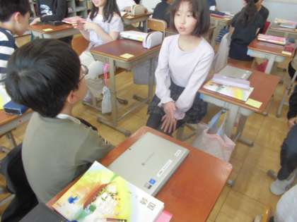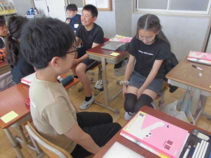 国語では「聞いて、考えを深めよう」の学習をしています。この単元では、インタビューをしながらお話を広げ、考えを深めていく学習をします。今日はゴールデンウィークのことを質問して、話を広げる練習をしました。