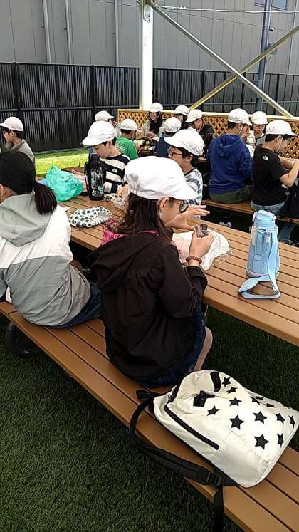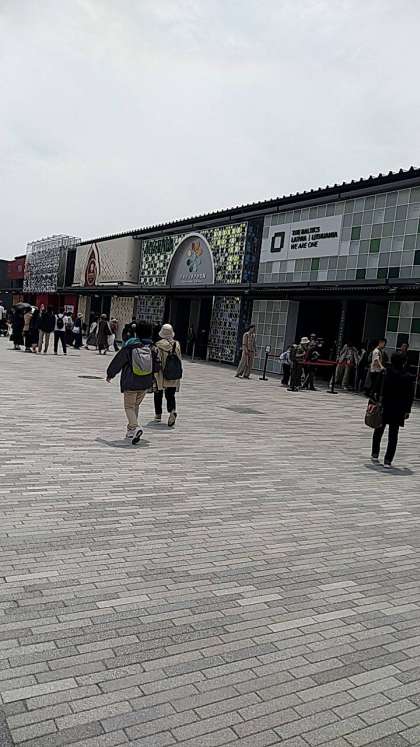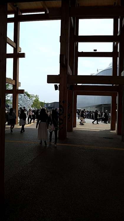万博に到着して、昼食を食べています。大屋根リングが立派です。