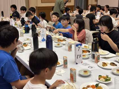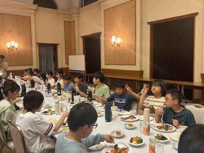 夕食を食べています。豪華な食事でみんなとてもうれしそうです。