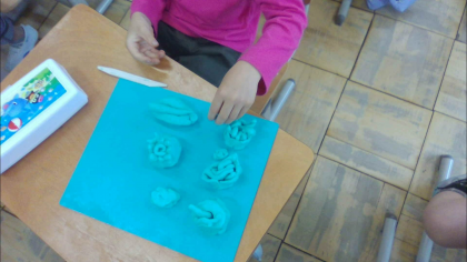 はじめにねん土たいそうでねん土を転がしたり、のばしたり、ちぎったりしてやわらかくしました。