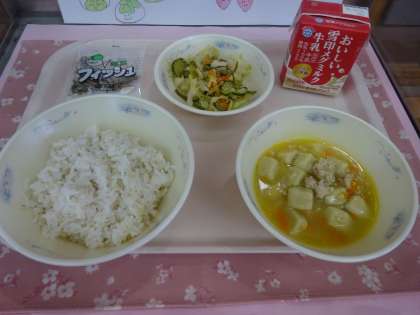 今日の給食は、麦ごはん・牛乳・高野どうふのそぼろ煮・ごま酢煮・じゃこでした。