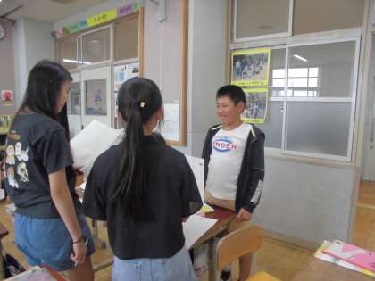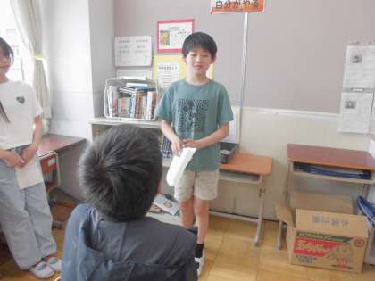 国語では「聞いて、考えを深めよう」という学習をしています。この単元では、学校に関わっている大人の人にインタビューをして、聞いたことや考えたことを友達と伝え合う学習をします。明日からインタビューが始まります。今日は、そのリハーサルをしました。インタビューをさせていただく学校関係者の方々、どうぞよろしくお願いいたしします