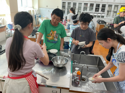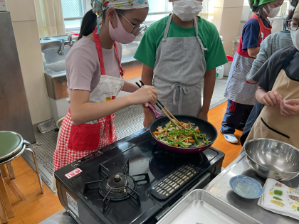 家庭科の授業で、調理実習を行い、調理実習を行いました。班で役割分担をして、安全に手際よく作ることができました。